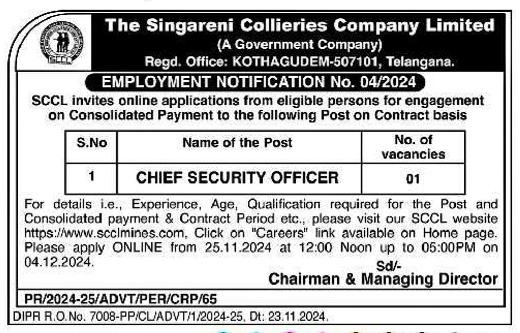 Telangana Jobs: తెలంగాణలోని సింగరేణి కాలరీస్ కంపెనీ లిమిటెడ్ నుంచి ఉద్యోగాల భర్తీకి నోటిఫికేషన్ విడుదలైంది. కాంట్రాక్టు ప్రాతిపదికన చీఫ్ సెక్యూరిటీ ఆఫీసర్ ఉద్యోగాల భర్తీకి షార్ట్ నోటిఫికేషన్ విడుదల చేశారు. అర్హత కలిగిన అభ్యర్థులు ఆన్లైన్ ద్వారా దరఖాస్తు చేసుకోవాలి. నవంబర్ 25వ తారీకు నుంచి డిసెంబర్ 4వ తారీఖు వరకు సింగరేణి కాలరీస్ వెబ్సైట్ www.scclmines.com ద్వారా దరఖాస్తు చేసుకోవచ్చు. విద్యార్హతలు, వయోపరిమితి, అనుభవం, జీతభత్యాలు, కాంట్రాక్టు వ్యవధి పూర్తి వివరాలను సింగరేణి వెబ్సైట్లో నవంబర్ 25వ తారీఖున విడుదల చేసే పూర్తిస్థాయి నోటిఫికేషన్ ద్వారా తెలుసుకోగలరు.
